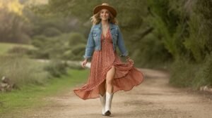 Pair a cream or earth-toned maxi dress with intricate embroidery on the sleeves and hem. Add a wide-brimmed hat and tall brown cowboy boots for that perfect desert-dream vibe.