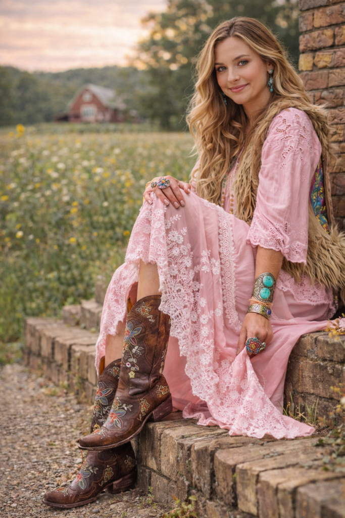 Cowboy boots bring structure and edge. Soft dresses bring movement. That contrast creates the magic.
