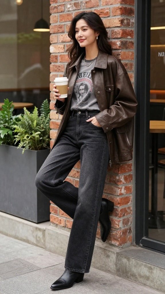 Add a fitted tee or lightweight knit under your leather jacket to keep the layers streamlined. If the jacket feels oversized, balance it with slimmer bottoms so the outfit doesn’t look bulky.