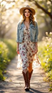 A floral midi dress is one of the easiest pieces to style with cowboy boots in spring. The contrast between feminine florals and western boots creates a balanced, effortless outfit. Look for lightweight fabrics and softer color palettes to keep the look seasonally appropriate. Layer with a denim jacket or light cardigan for cooler mornings.